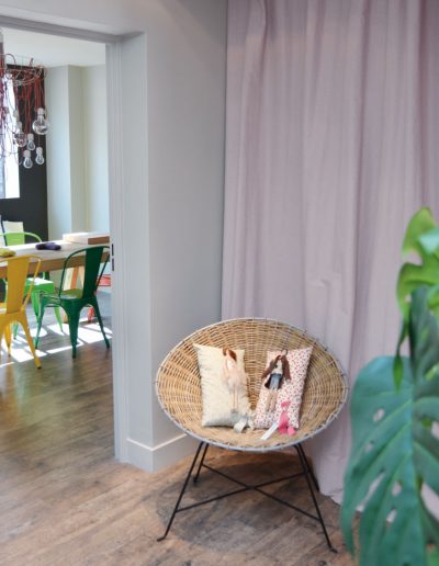 L’APPARTEMENT est une agence de design dont la vocation est avant tout la création de produits cosmétiques singuliers. Un espace joyeux et un peu fou dans lequel cette équipe partage ses envies, ses passions, ses coups de cœur. Dans lequel ils rêvent aussi pas mal : à des formes exclusives, à des couleurs étonnantes, à des mélanges exubérants, à de nouvelles émotions. 100m² sous les toits des Batignolles décorés avec originalité pour une petite équipe en quête permanente de drôles d’inventions. J’ai utilisé du papier peint à leur image : décalé, mais intemporel ! Deborah Bowness, Cole and Son, les meubles Conran ou encore, un lustre de la petite friture…