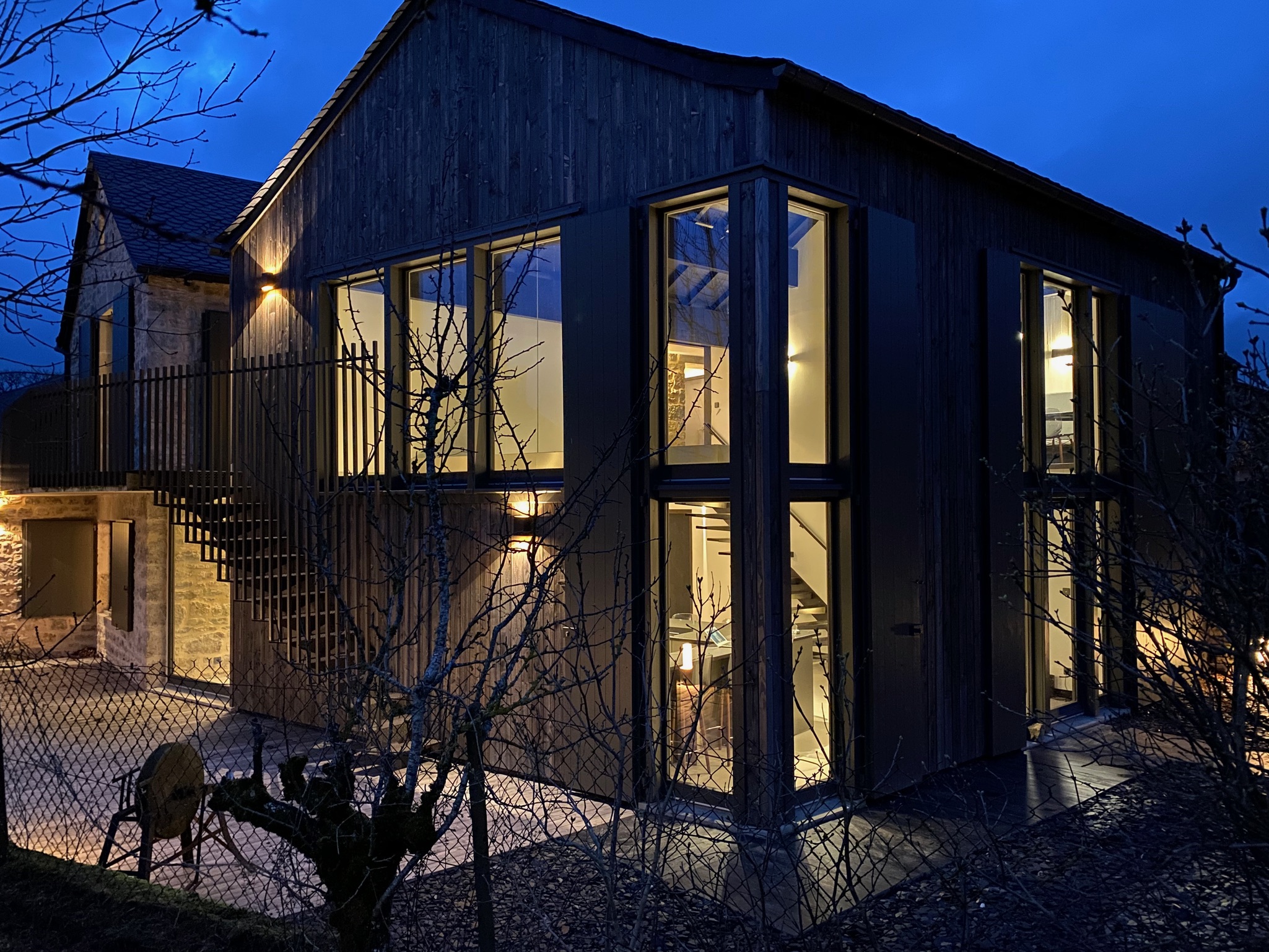 Nous démolissons le hangar, rénovons la grange et construisons une extension décalée de la grange pour créer une faille offrant des vues ciblées sur un relief marqué de la région.