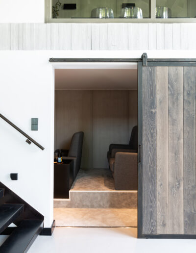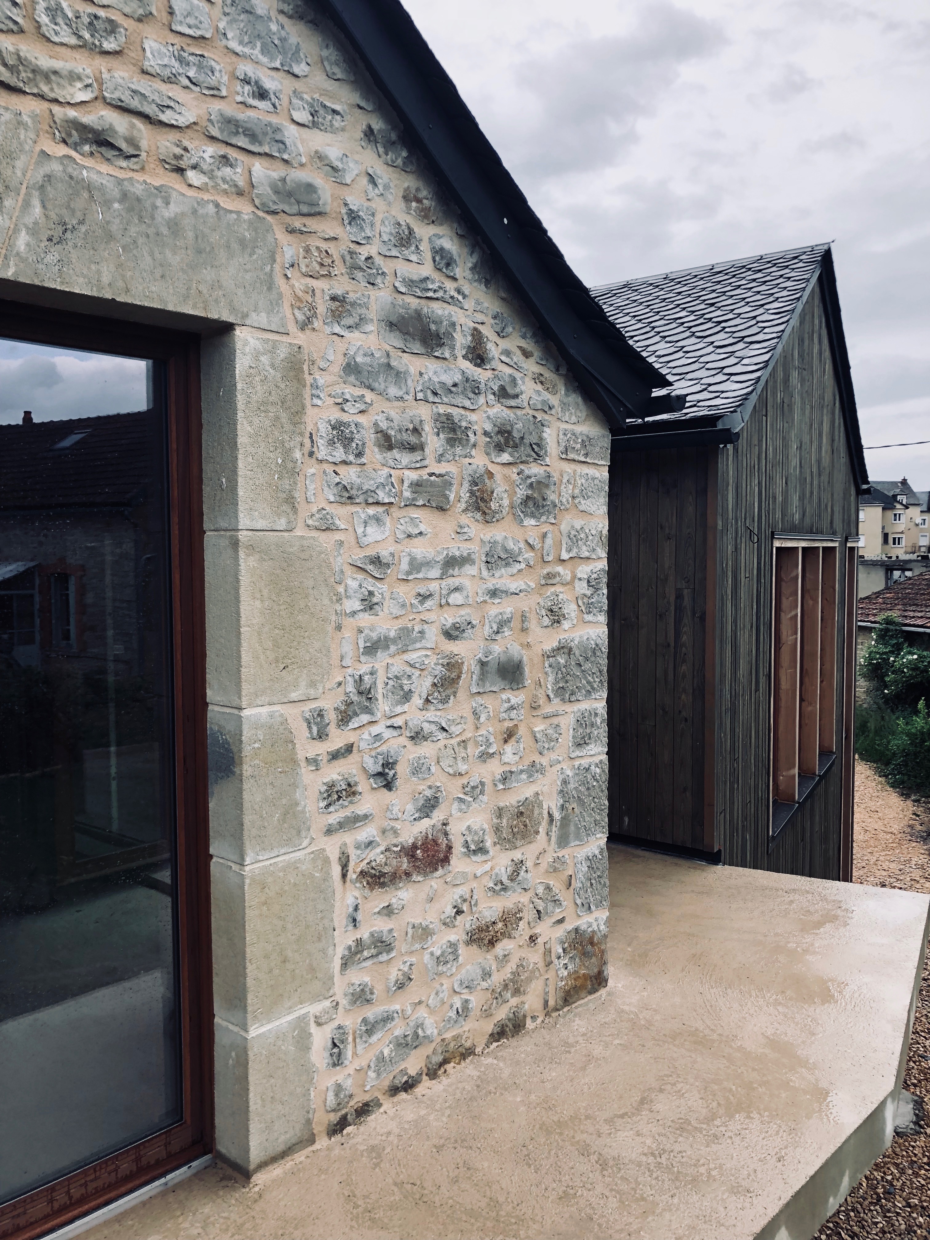 Les matériaux d’origine, conservés et mis en valeur, côtoient le béton brut de décoffrage, le verre et l’acier.