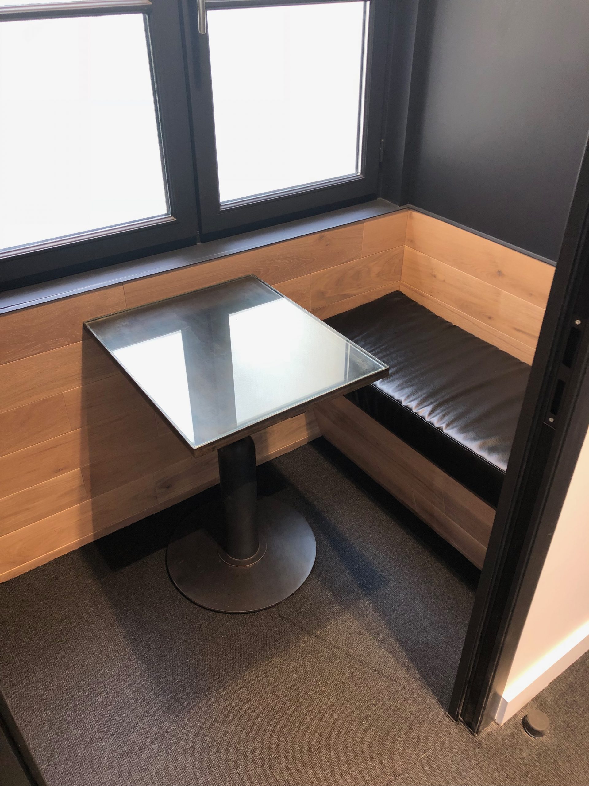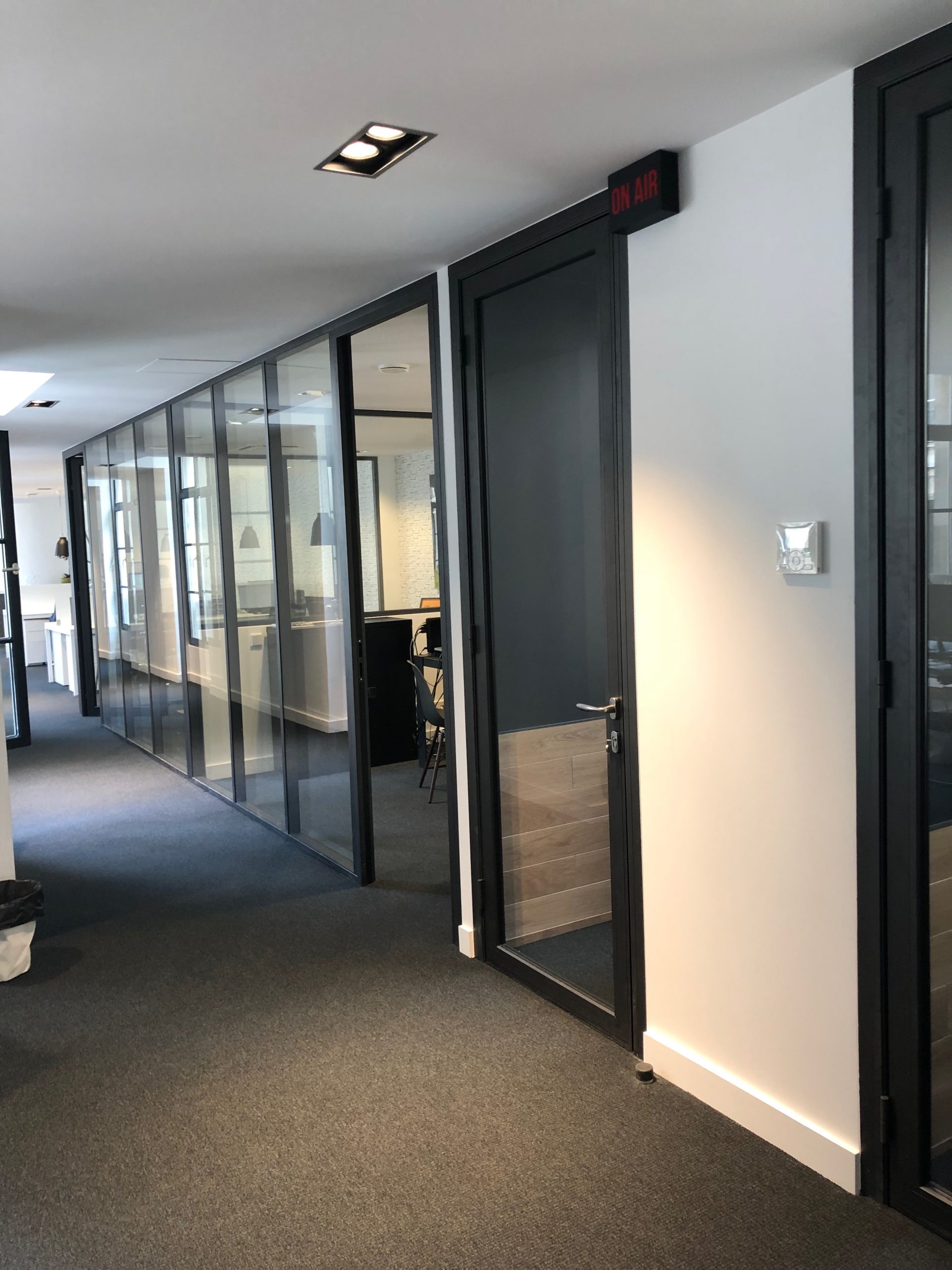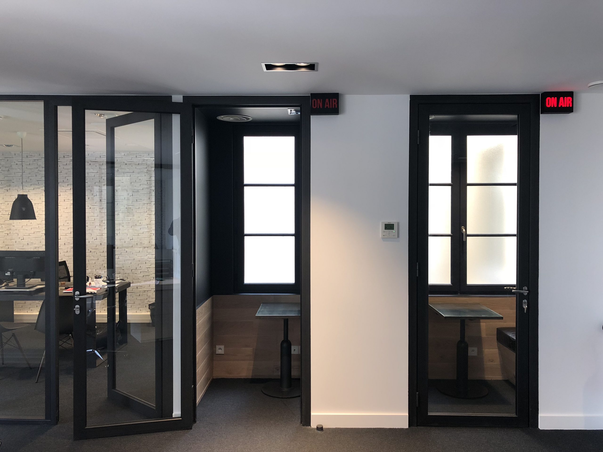 Réaménagement d’un étage de bureau dans l’immeuble “94V” pour une adaptation à une nouvelle entreprise ayant de nouveaux besoins. Des cabines téléphoniques permettent de s’isoler pour se concentrer. A l’instar des studios d’enregistrement les ON AIR s’allument et s’éteignent automatiquement selon l’usage.