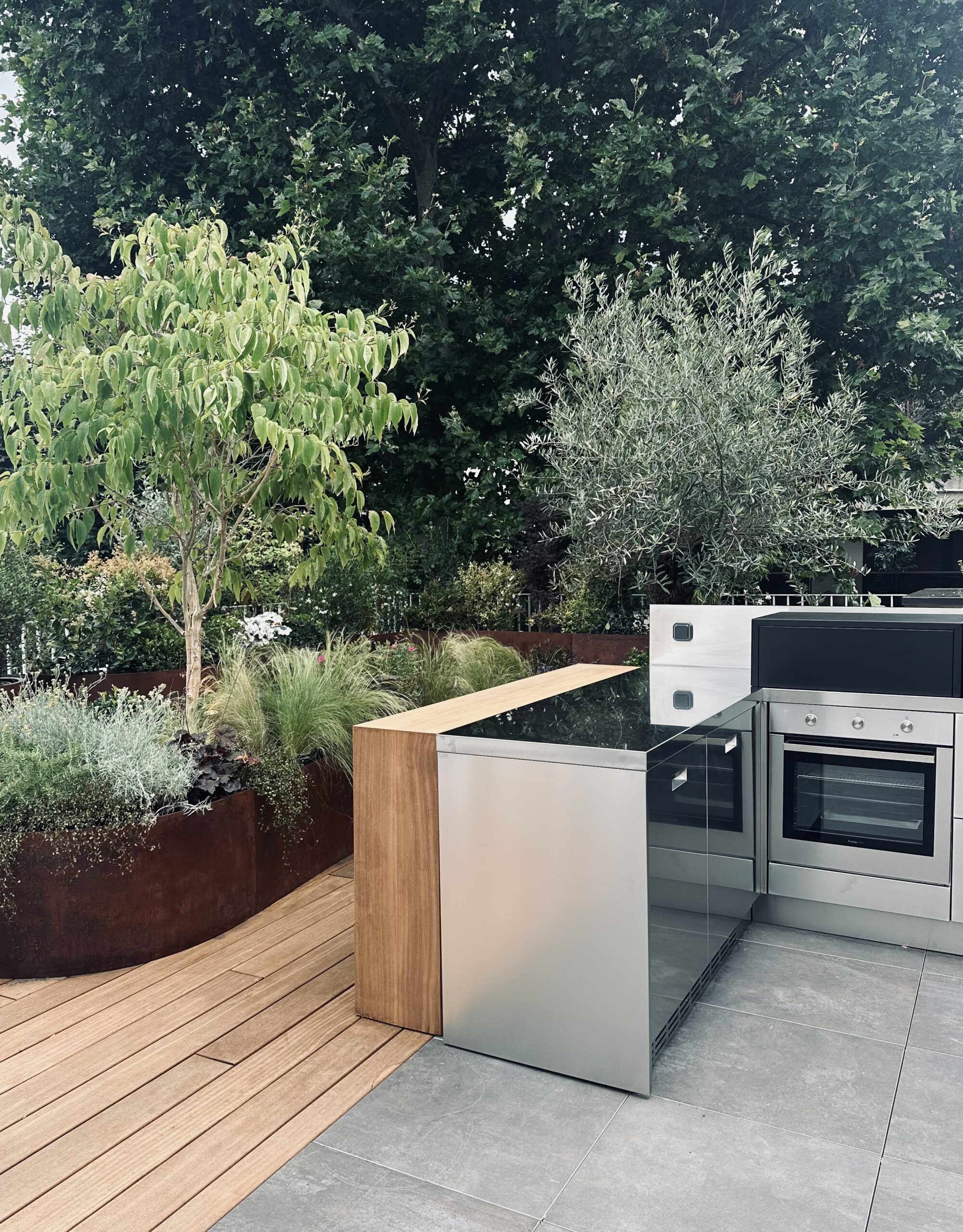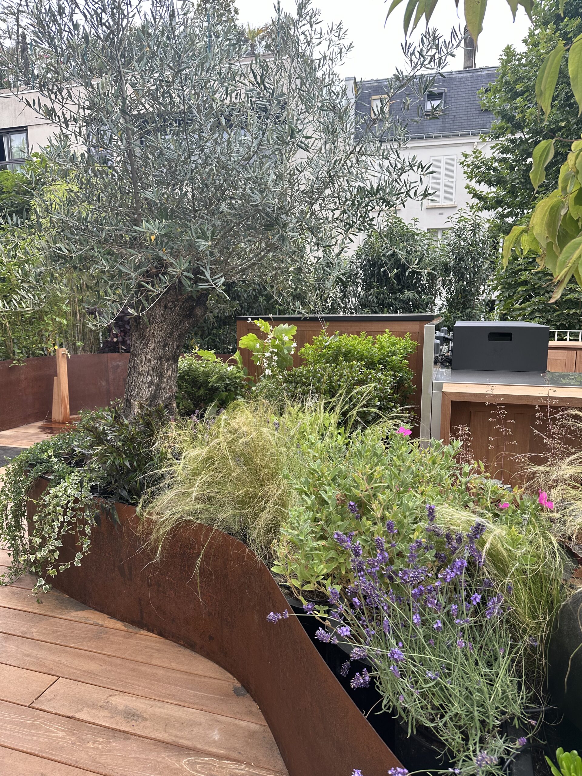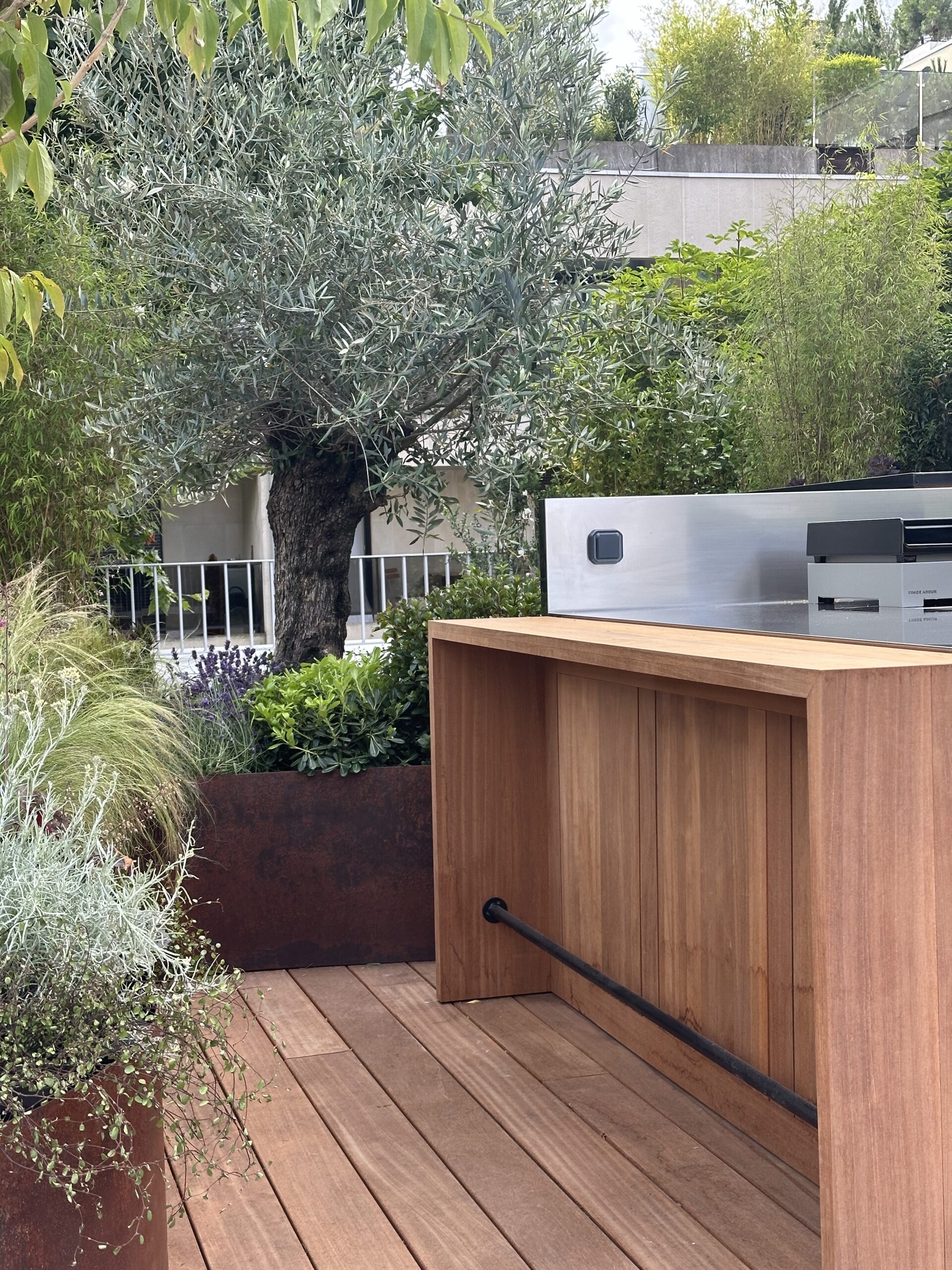 Le projet consistait en l’aménagement d’un toit terrasse. en espace de vie extérieur/ Nous avons utiliser le bois le corten et l’inox pour ce projet.