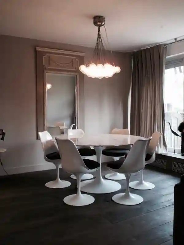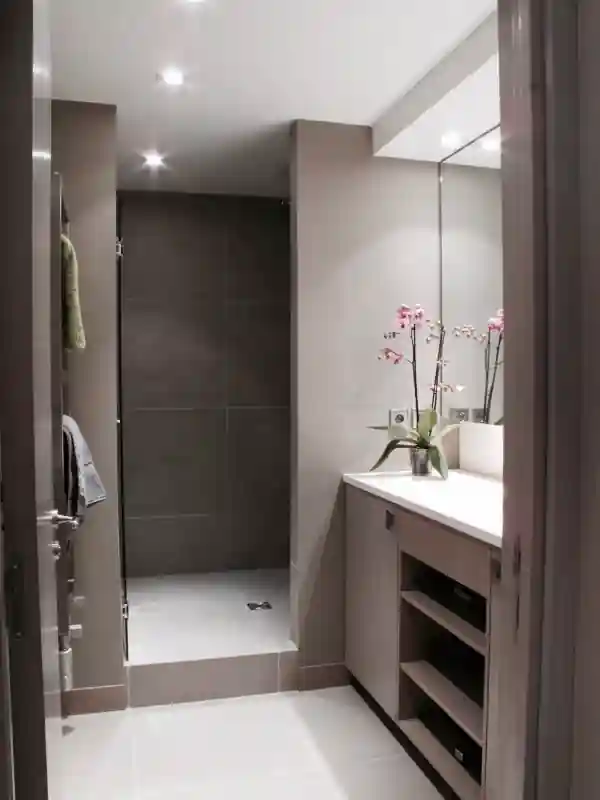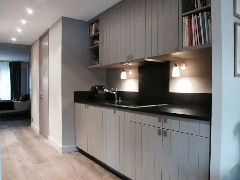 Un appartement dans un immeuble 1970 complètement ré-agencé et réorganisé. A la fois intemporel et moderne avec sa cuisine traversante, tout l’appartement tourne autour de cette pièce, un vrai condensé de sur mesure.